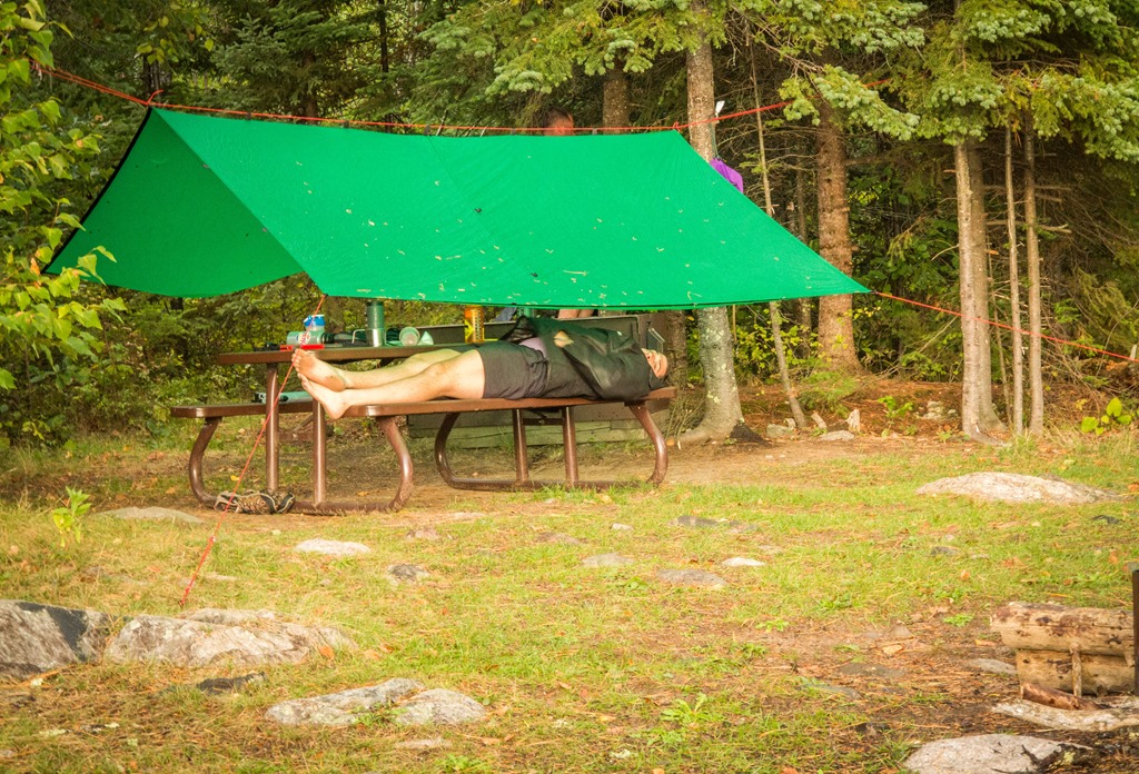 Radio equipped and following the GPS, the boys paddled away under sunny skies. As they diminished in size, the trip’s first mosquitoes buzzed into camp. Then saturated clouds slid overhead, and I strung up my 10-foot tarp over the picnic table before they dripped on me.