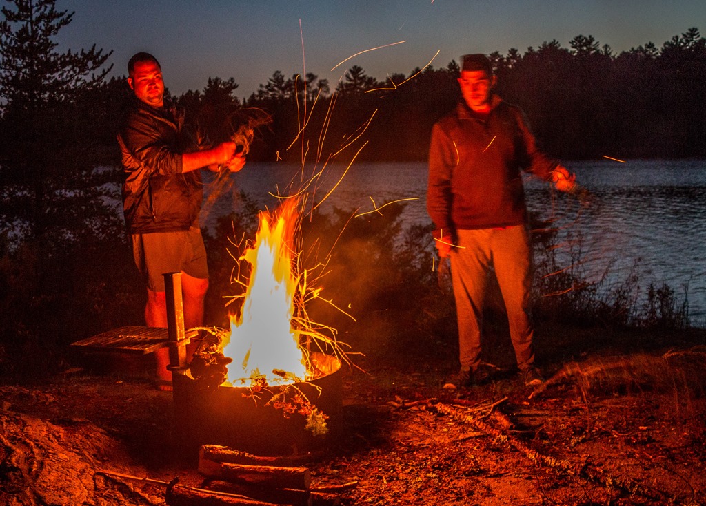 The clouds started moving in after dinner. While Kyle was preparing to light the evening’s entertainment, two loons paddled silently by in water behind him. With a tufted gray comforter of clouds hiding any glimmer of the northern lights, I turned in early.