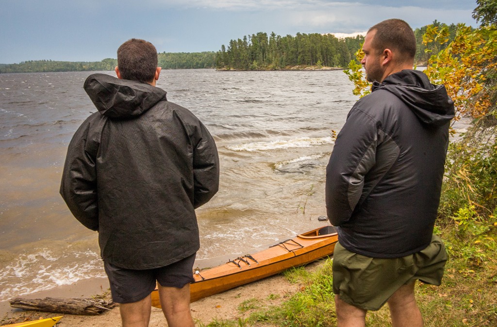 Shortly after their return, a 15 mph south wind whipped whitecaps into the water. We hauled the boats off the beach before the approaching thunderstorm further churned the water and then took refuge under the tarp. Braden and I padded the cheese grater bench with dry bags. Kyle sat on his weightlifter-thick glutes.