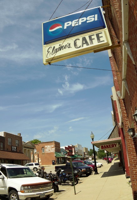 Ed planned our mileage for the day at 292, but his GPS didn’t know about the detour on MN 16, which is the road we mostly followed. Still, it got us to Spring Valley, where we lunched at Elaine’s Café on Main St. Ed asked the waitress—at a café they have waitresses, not servers—is she was Elaine. No, the friendly young woman with highlighted hair said, “I’m her granddaughter Darla (at least I think that is what she said her name was), Elaine is in the kitchen.”