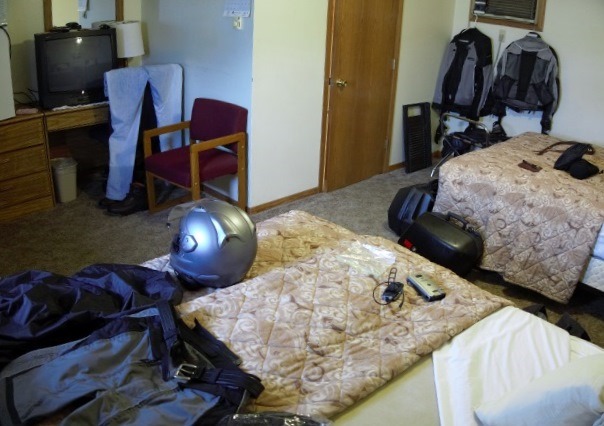 When a women drove up, hauled a comforter out of her trunk and disappeared into a room to the left of the office, I had to get up and find out why. The Dakota HorizInn has a laundromat that’s open the the public. Ed just toddled in that direction with an armful of clothes that, he’s just discovered, didn’t stay dry in the waterproof fabric bag that rides behind him. It has a rain cover, and he put in place when we left this morning, but it didn’t stay in place in the buffeting wind.