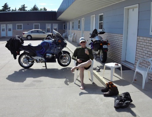 Just before 1700 the front passed and the sun poured through a sucker hole in the stratus layer of clouds. Taking up residence in one of the plastic chairs outside Room 27 with Jack Daniels and Rocky Patel, I made grotesque shadow creatures with my toes and watched life pass by on SD 37. Ed read his Kindle. A number of Harleys grumbled by, and a few of their pilots, seeing me sitting by the clothing draped bikes, would wave.
