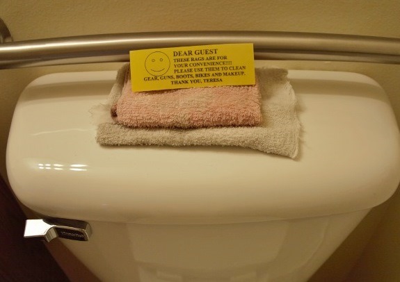 Our room was fairly pricey at $86 for the night, but it had two dry beds, heat, and hot water. It could use a few more robust hangers and secure stanchions from which to hang them. There were, however, rags on the back of the toilet for cleaning “gear, guns, boots, bikes, and makeup.” And Teresa thanked us for using them. All we can do is hope everything will dry by dinner, if not tomorrow. It looks like the rain has stopped. I hope that lasts, and that we can find someplace within walking distance for dinner.
