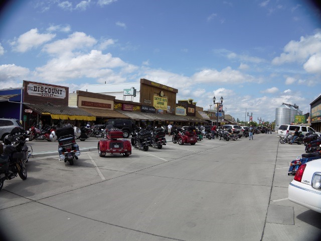 wall (640x480)Wall is where I disconnected from the day. The bike rally in Sturgis starts this weekend, and on every road we saw pods of motorcycles, mostly snarling Harleys. In Wall, which is dominated by its legendary drug store, the streets were filled with thousands of motorcycles and a greater number of humans, mostly older, all seemingly attired in denim and leather and ink framed by sleeveless t-shirts and tank tops. The noise was an omnipresent visceral sonogram.