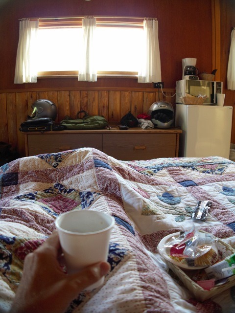 Comfy under the covers, he handed me the complimentary basket from the mini-fridge that contained an orange, chocolate chip crunchy granola bar, apple juice box, Otis Spunkmeyer blueberry muffin, and instant oatmeal. I ate everything but the oatmeal because Ed made coffee, not hot water, and he handed me a cup as I typed away here on the Road Warrior, my diminutive HP laptop that fits in Blue’s saddle bags has a keyboard large enough to accommodate my phalanges. Out the window I can see the sun playing on the mountain, and the power pole and its transformer. Life couldn’t be better.