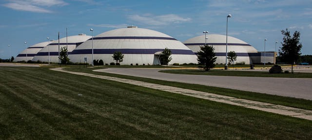 Like a prairie tout setting up a mark with predictable wins, these small towns set me for a surprise in Grand Meadow. On the farm field shoreline rose five white domes, like huge ping pong balls buried in the backyards of the houses at the edge of town. There was a sign out front, but opposite traveling traffic blocked my readable view. As we refueled in town, Ed mentioned alien space craft; I guessed school.